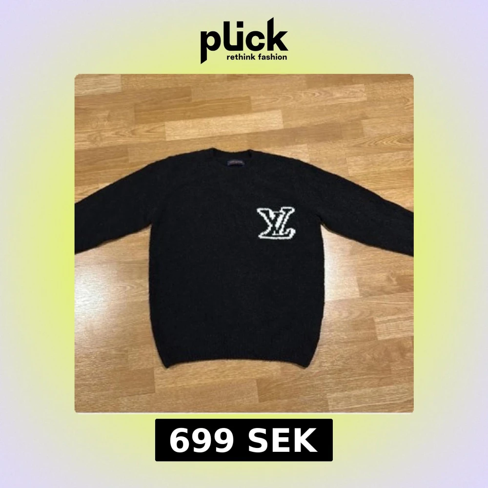 Svart stickad tröja från Louis Vuitton med stort vitt LV-logo på bröstet. Tröjan har rund hals och långa ärmar, perfekt för dig som gillar exklusiva märken och vill ha en clean look med tydlig branding. Materialet är mjukt och ger en skön känsla.