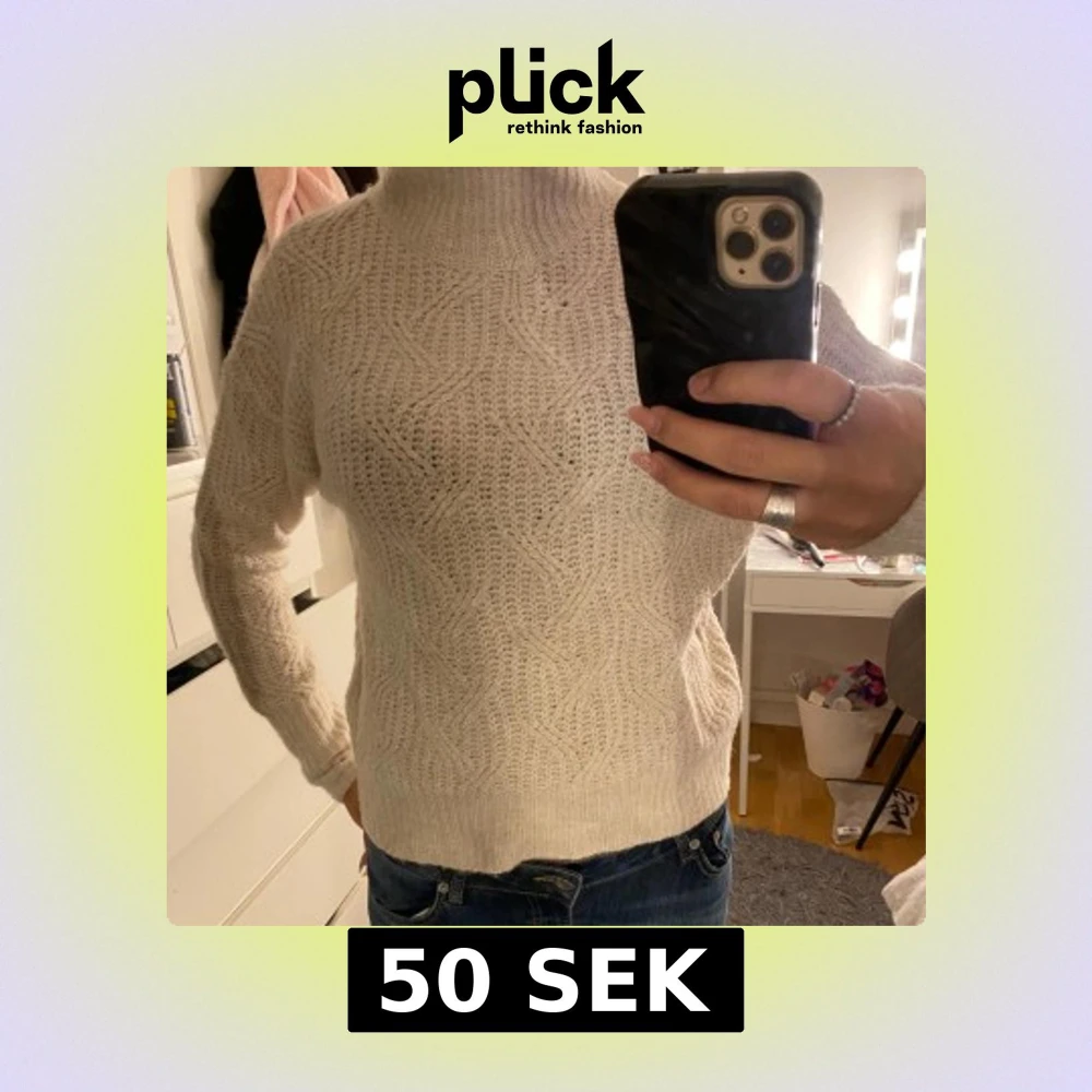 Mysig beige stickad polotröja med snyggt strukturmönster. Tröjan har lång ärm, hög krage och ribbade muddar. Perfekt för lager-på-lager och chill höst- och vinterstil.
