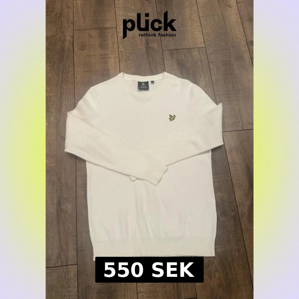 Vit stickad tröja från Lyle & Scott i storlek M. Klassisk rund hals och långärmad modell med ribbade muddar. På bröstet sitter den ikoniska gula örn-loggan. Materialet är mjukt och har en diskret struktur som ger en schysst look.