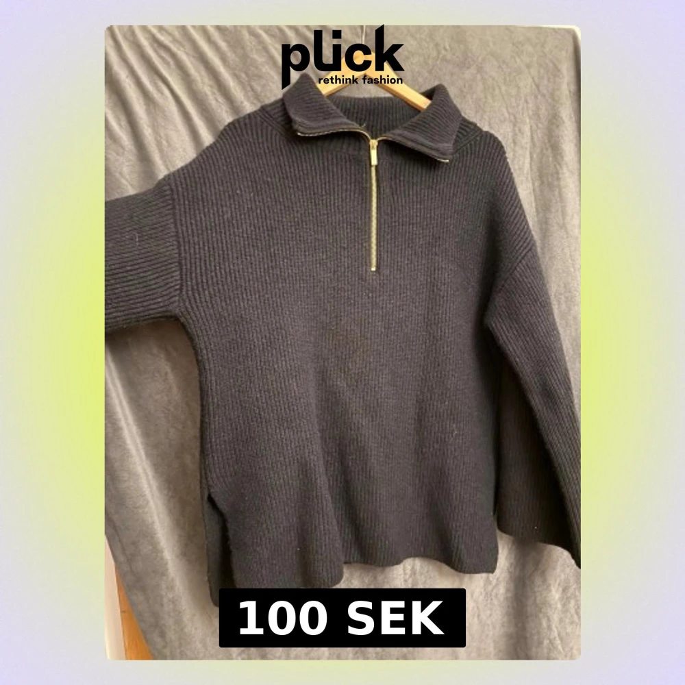 Mysig svart stickad tröja med hög krage och guldfärgad dragkedja framtill. Tröjan har lång ärm, ribbstickad struktur och avslappnad passform. Perfekt för kyliga dagar och enkel att styla till olika outfits.
