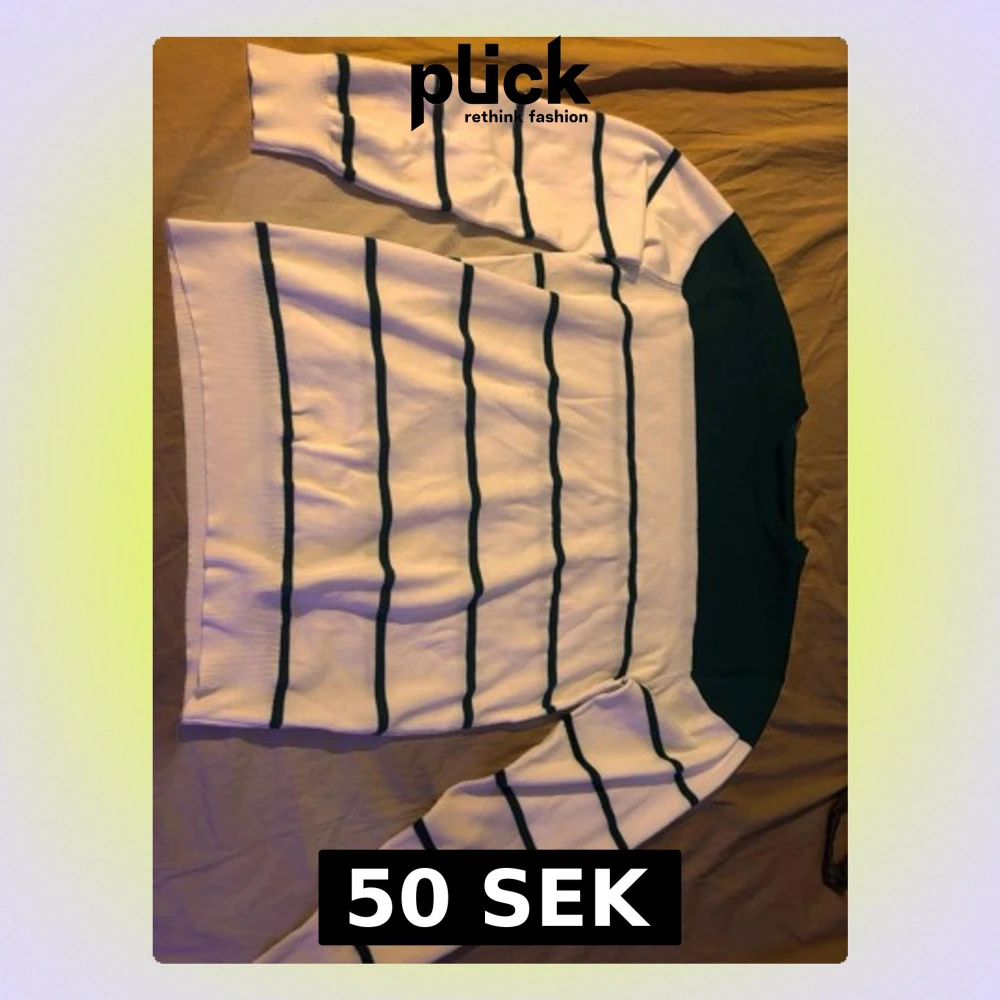 Säljer en vit stickad tröja med tunna gröna horisontella ränder och en bred grön panel upptill vid axlar och hals. Tröjan har lång ärm och klassisk rund halsringning. Perfekt för dig som gillar enkel men snygg design.