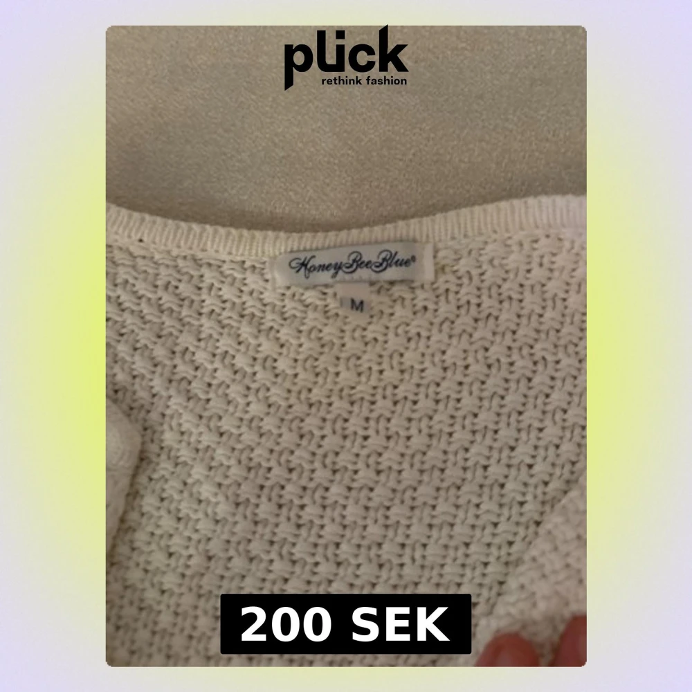 Säljer en vit stickad kofta från HoneyBeeBlue i storlek M. Koftan har grovstickad struktur, rund halsringning och två snygga silverfärgade knappar framtill. Långa ärmar och praktiska fickor gör den både chill och stilren.