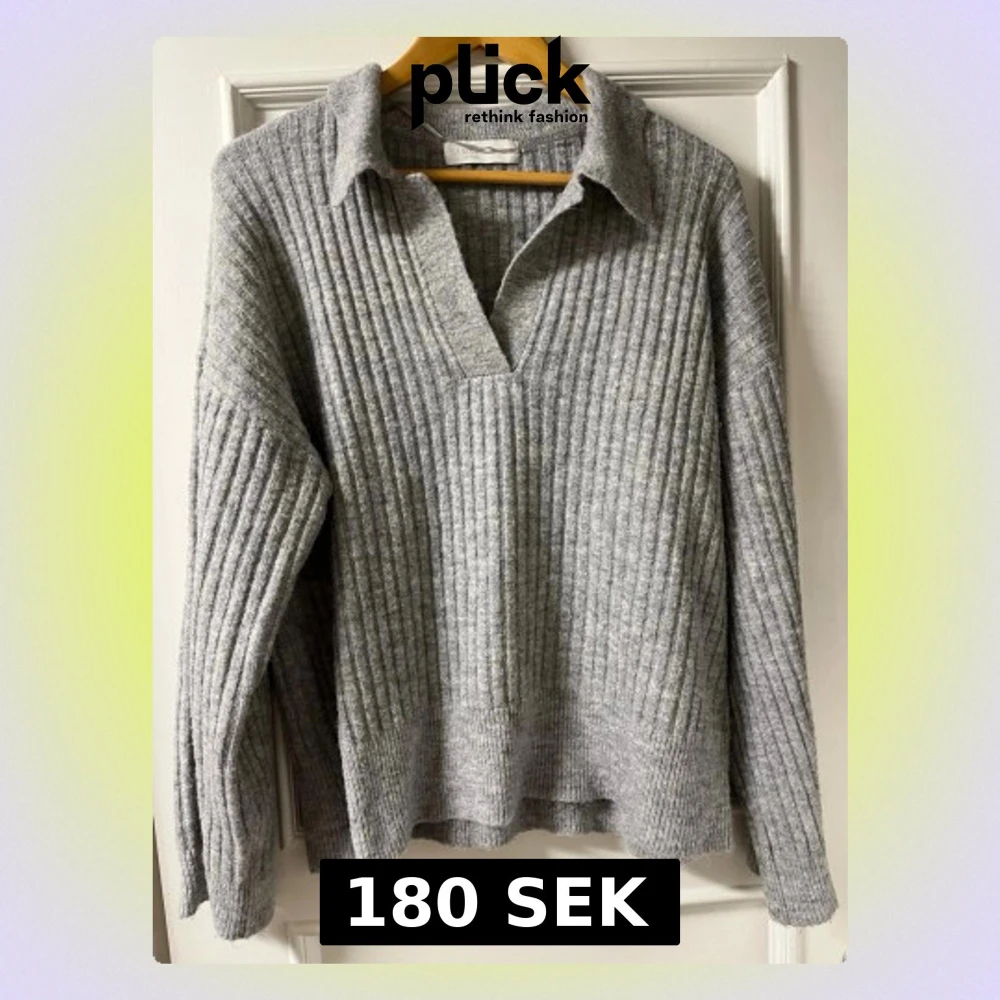 Säljer en grå ribbstickad tröja från Samsa Collection. Tröjan har en avslappnad passform, krage och djup v-ringning. Materialet är mjukt och passar perfekt för kyligare dagar. Långa ärmar och breda muddar ger en trendig look.