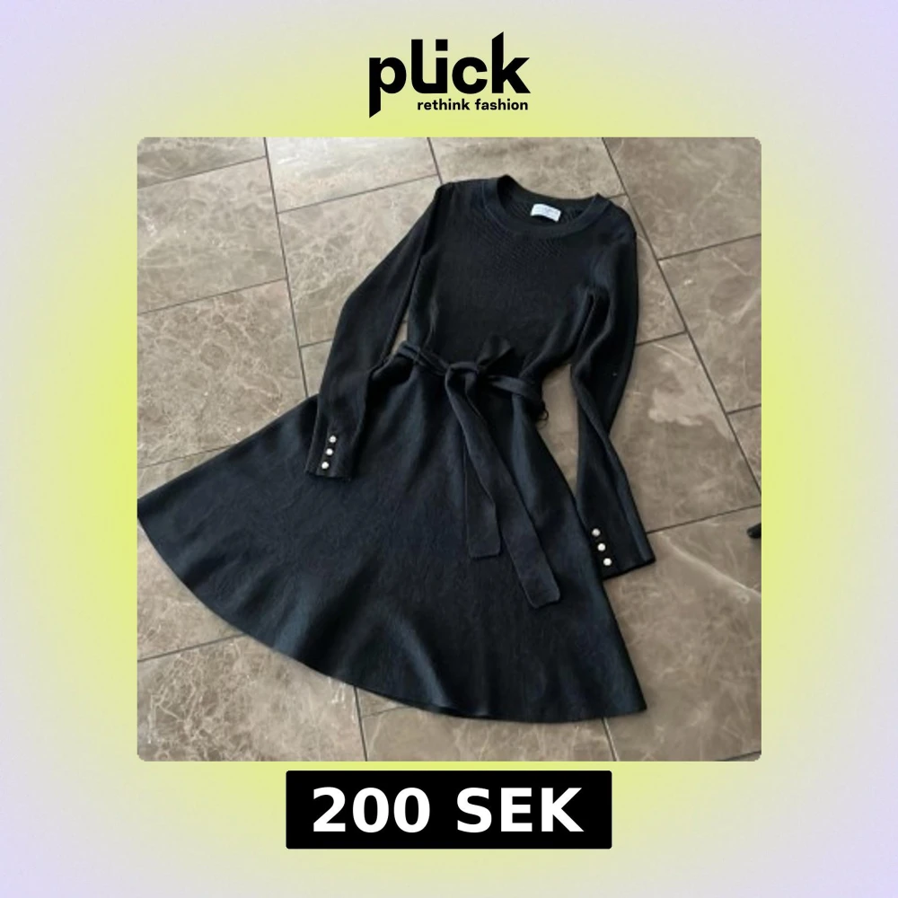 Supersnygg svart stickad klänning från Holly & Whyte med rund hals, långa ärmar och tre silvriga knappar vid ärmsluten. Klänningen har ett knytband i midjan som ger en fin siluett och är i mjukt, ribbat material. Perfekt för dig som gillar stilrena och bekväma plagg.