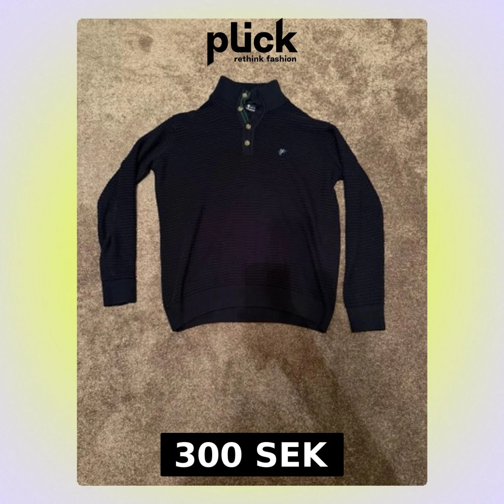 Mörkblå stickad tröja från Denim Culture med krage och knappar framtill. Tröjan har diskret strukturmönster, ribbade muddar och gröna ränder på insidan av kragen. Liten broderad logga på bröstet. Perfekt för dig som gillar klassisk och stilren look. Storlek M