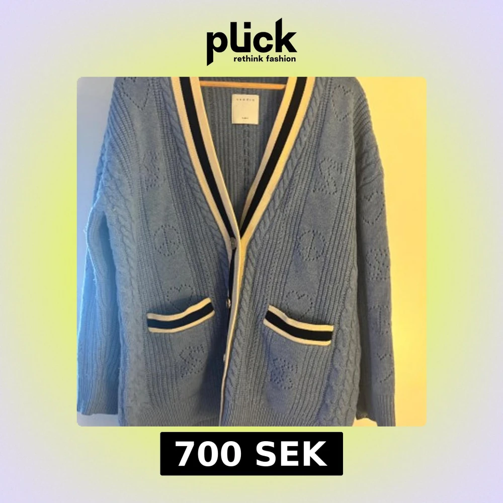 Säljer en snygg blå stickad kofta från Sandro med hjärtmönster och kabelstickade detaljer. Koftan har långa ärmar och två fickor med randiga kanter. Perfekt för kyliga dagar!