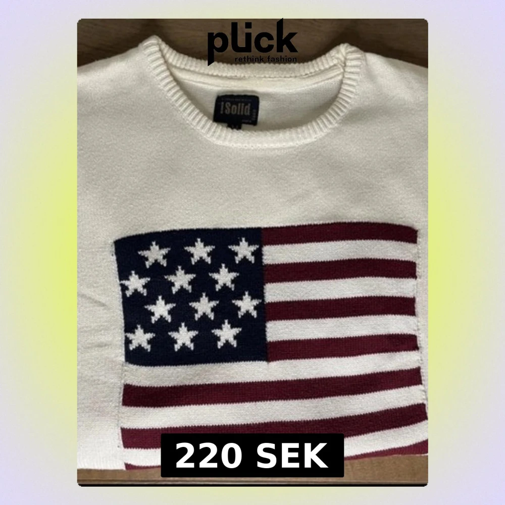 Vit stickad tröja av märket !Solid med en USA flagga som tryck i storkek M. Tröjan är i gott skick och har inga defekter utöver en liten fläck vid armhålan.