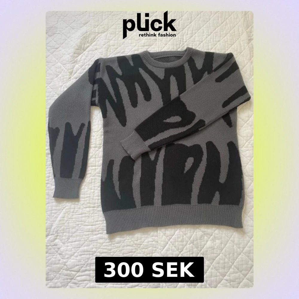 Säljer en grå stickad tröja med svart abstrakt mönster. Tröjan har rund halsringning, ribbade muddar och nederkant. Materialet ser ut att vara mjukt och bekvämt, perfekt för kyligare dagar. Passar dig som gillar en unik och modern stil.