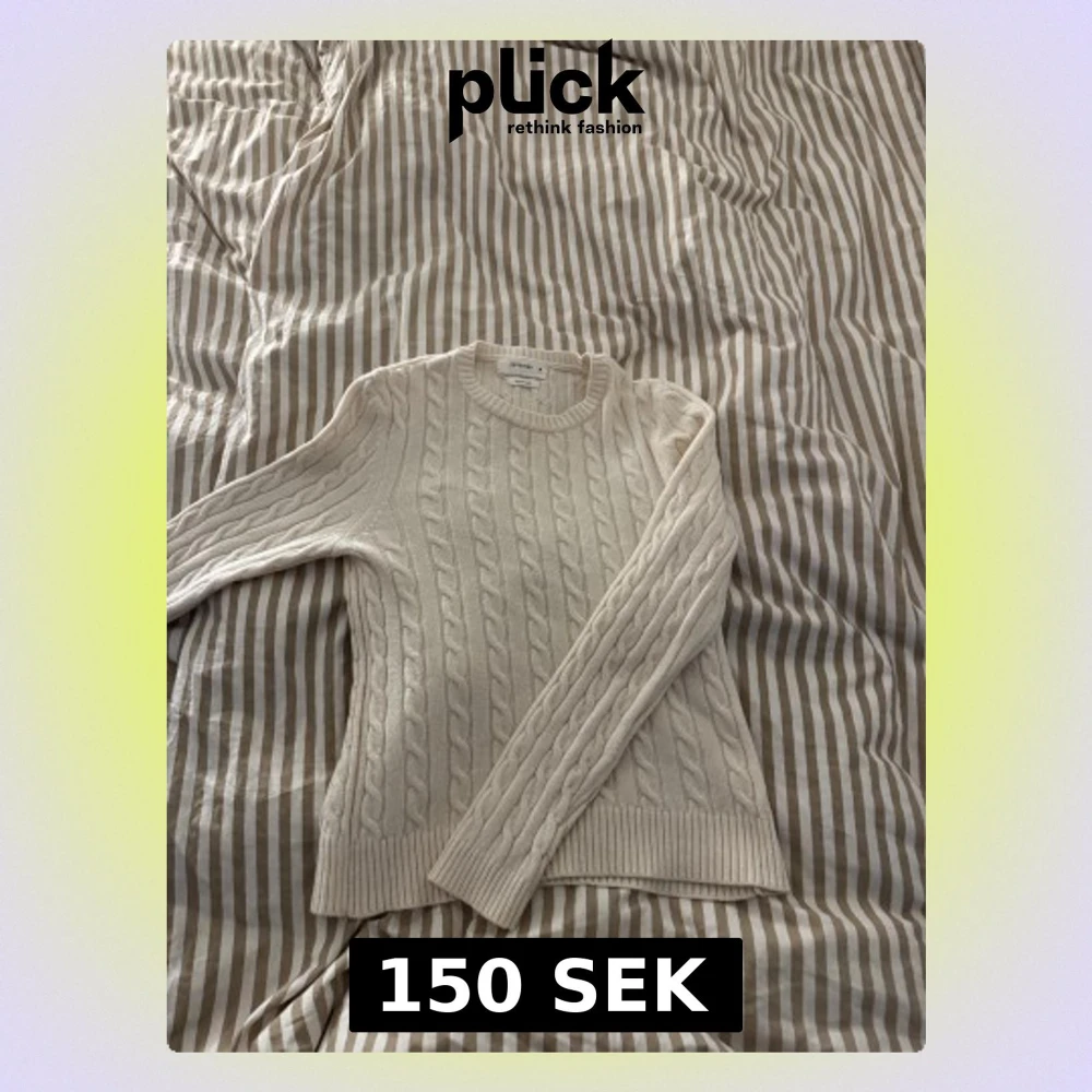 Snygg vit kabelstickad tröja från Reserved med rund hals och långa ärmar. Tröjan har ett klassiskt flätmönster och ribbade muddar vid ärmslut och nederkant. Storlek M