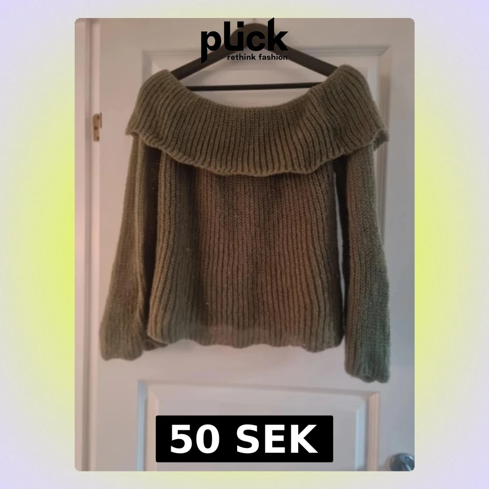 Säljer en olivgrön stickad tröja med bred offshoulder-krage. Tröjan har grov ribbstickning och långa ärmar med lite loose passform. Perfekt för dig som gillar chill och snygg stil med en twist. Materialet är mjukt och värmande stickat garn.
