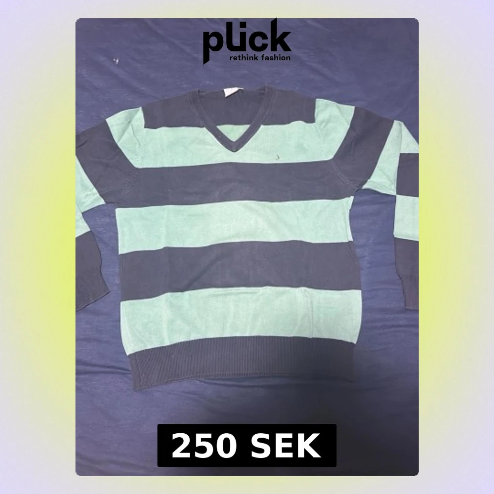 Snygg stickad tröja med breda horisontella ränder i mörkblått och ljusgrönt. Tröjan har V-ringning, långa ärmar och ribbade muddar vid ärmslut och nederkant. Perfekt för dig som gillar en avslappnad men stilren look.