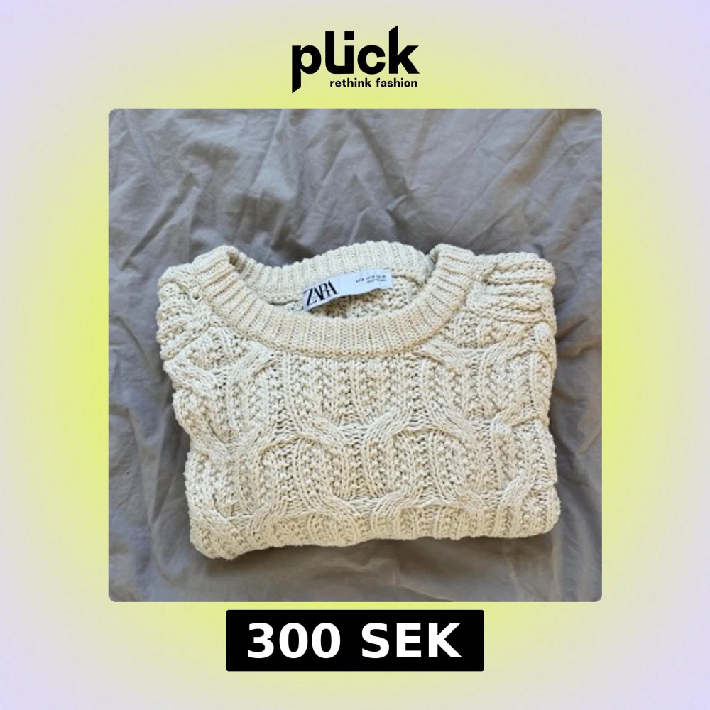 Säljer en beige stickad tröja från ZARA med grovt flätmönster och rund hals. Tröjan har långa ärmar och svart kant längst ner för en snygg kontrast. Perfekt för dig som gillar chill och stilren vibe. Materialet är mjuk bomull som känns skönt mot huden.