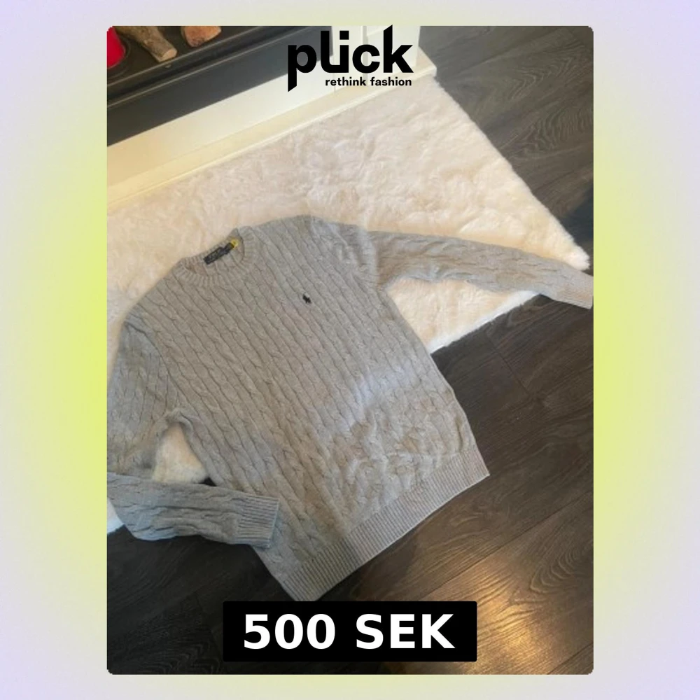 Snygg grå kabelstickad tröja från Polo Ralph Lauren med rund halsringning och klassisk broderad logga på bröstet. Tröjan har ribbade muddar vid ärmslut och nederkant, perfekt för lager på lager och stilren look.