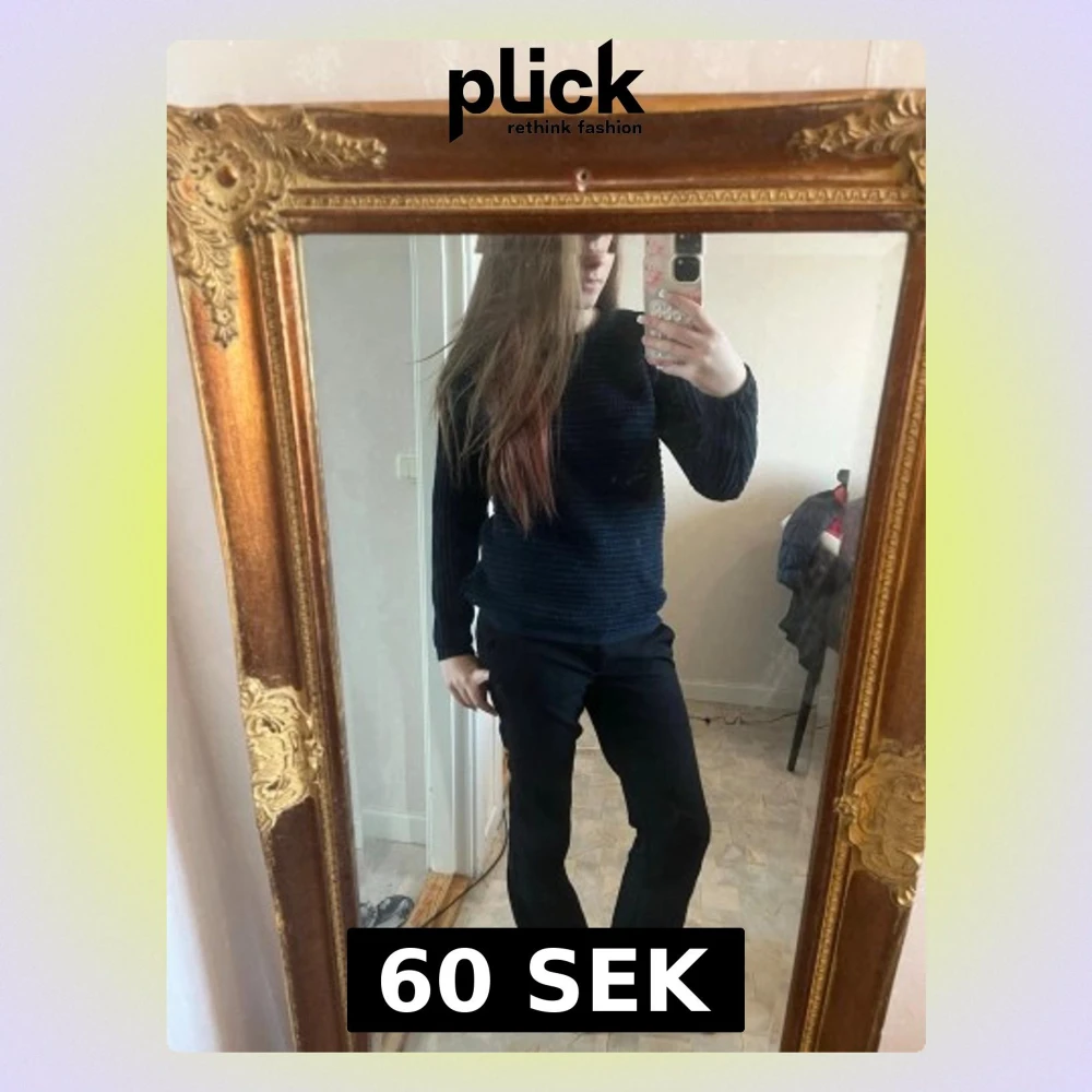 Säljer en mörkblå ribbstickad tröja med rund hals och långa ärmar. Tröjan har en enkel, stilren design och är gjord i ett mjukt stickat material som passar perfekt till jeans eller byxor. Perfekt basplagg för garderoben.