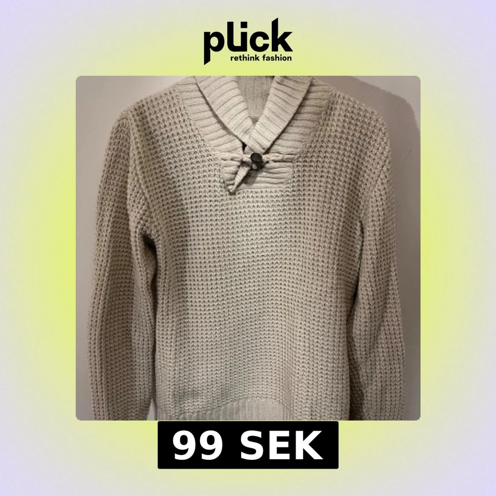 Säljer en stilren beige stickad tröja med en unik krage och knappdetalj framtill. Tröjan har långa ärmar och ett texturerat mönster som ger en mysig känsla. Perfekt för kyligare dagar och sommarkvällar. 158-164 är mer som en small!!!