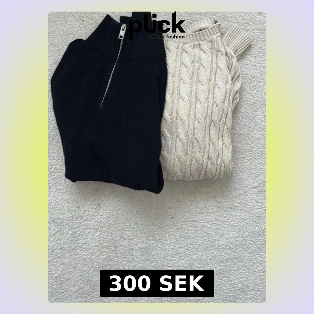 Två stickade tröjor: en svart med hög krage och dragkedja framtill, samt en beige kabelstickad tröja med klassiskt flätmönster. Båda har lång ärm och ribbade detaljer. Perfekta för lager på lager och snygga till jeans eller kjol. Ena XL men liten i storlek så passar L och den andra M säljer båda för 300kr tillsammans.