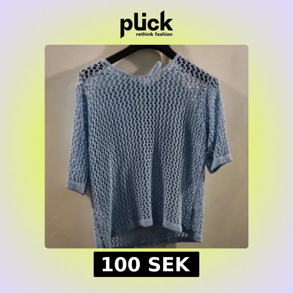 Säljer en ljusblå stickad nättröja med trekvartsärm och knytband i nacken. Tröjan har en luftig och öppen stickning som ger en cool och avslappnad look. Perfekt att slänga över ett linne eller bikini. 100kr
