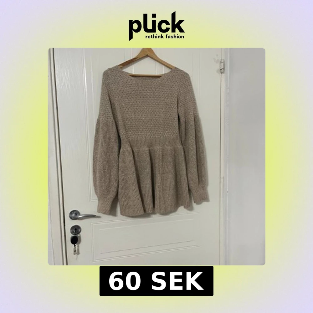 Beige stickad tröja från SHEIN i storlek M. Tröjan har långärmade ballongärmar, rund hals och ett ribbat midjeparti som ger en snygg peplum-effekt. Materialet är 100% polyester och den har en mjuk, grovstickad struktur som känns cozy och trendig.