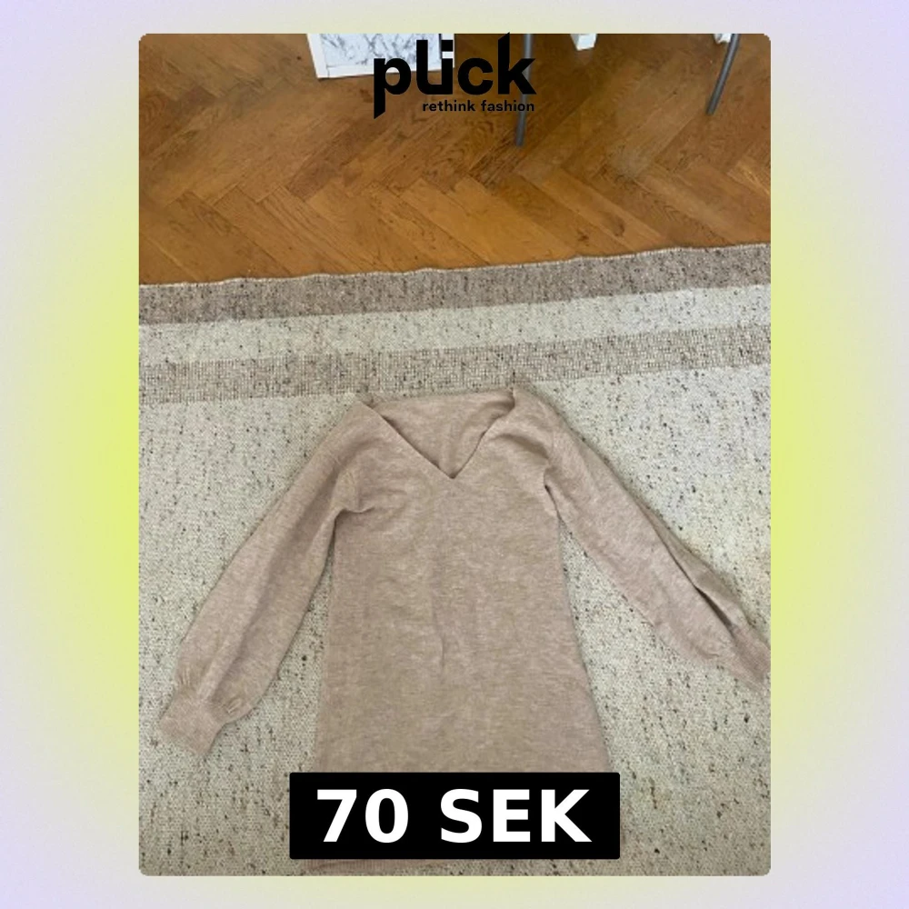 Mysig beige stickad tröja med v-ringning och långa ärmar. Tröjan har ribbade muddar vid ärmslut och nederkant, vilket ger en snygg och enkel look. Perfekt för lager-på-lager under kyliga dagar. Materialet är mjukt och skönt mot huden.,sitter ett spänne bak på baksidan som går att ta bort .står inte vilket märke.är som en klänning