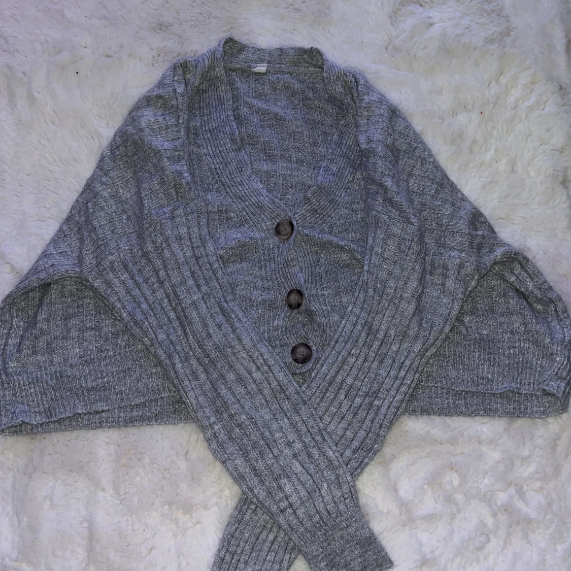 En grå stickad topp med knappar. Skönt material. Visar magen. Använd en gång. Storlek M.