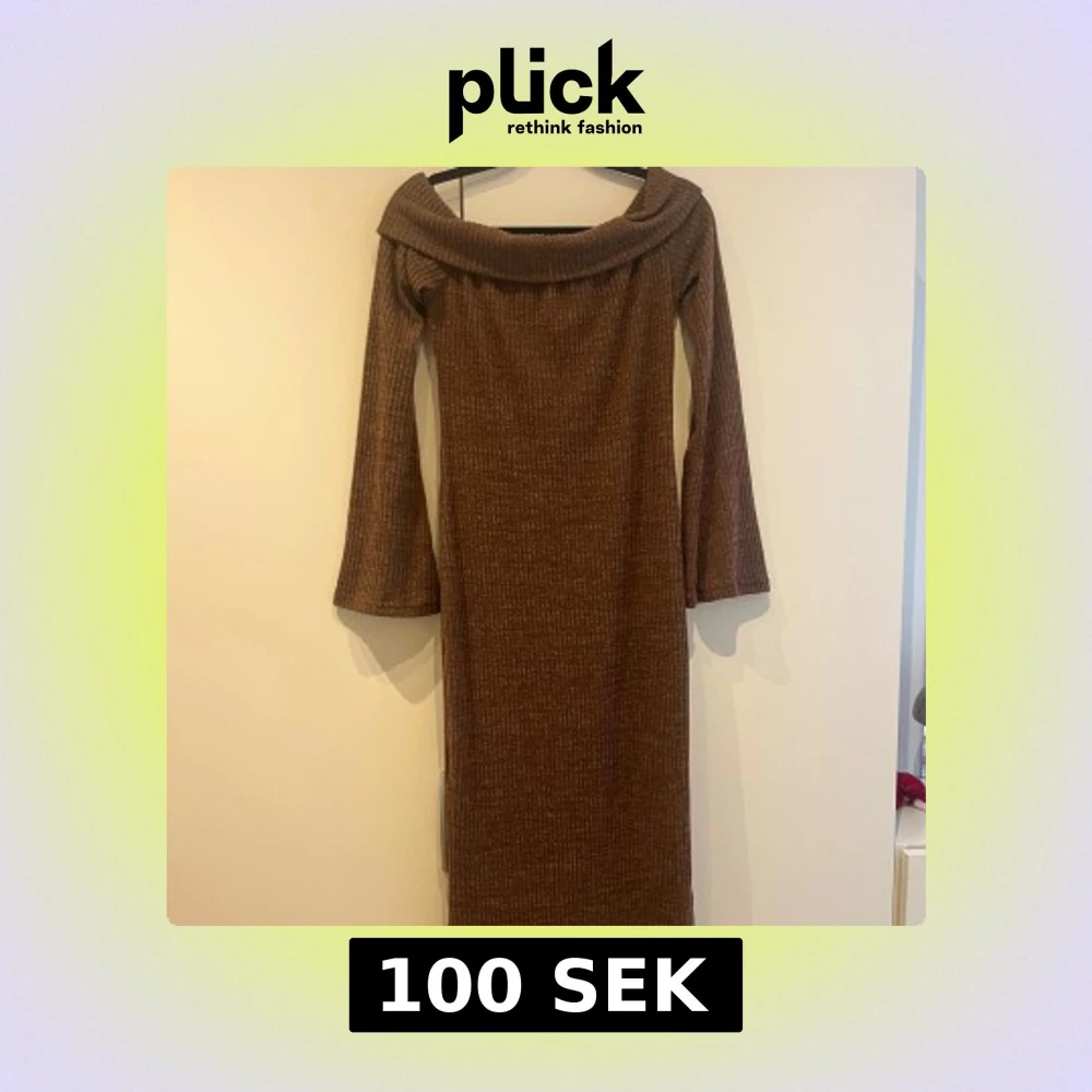 Säljer en lång brun ribbad långklänning med offshoulder-krage och långa ärmar. Klänningen har en mjuk, stickad känsla och är perfekt för dig som gillar en stilren och bekväm look.