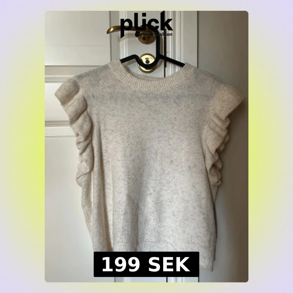 Säljer en stickad topp med volangärm. Ganska liten i storleken. Toppen är i storlek M men skulle säga att den motsvarar storlek XS eller S.