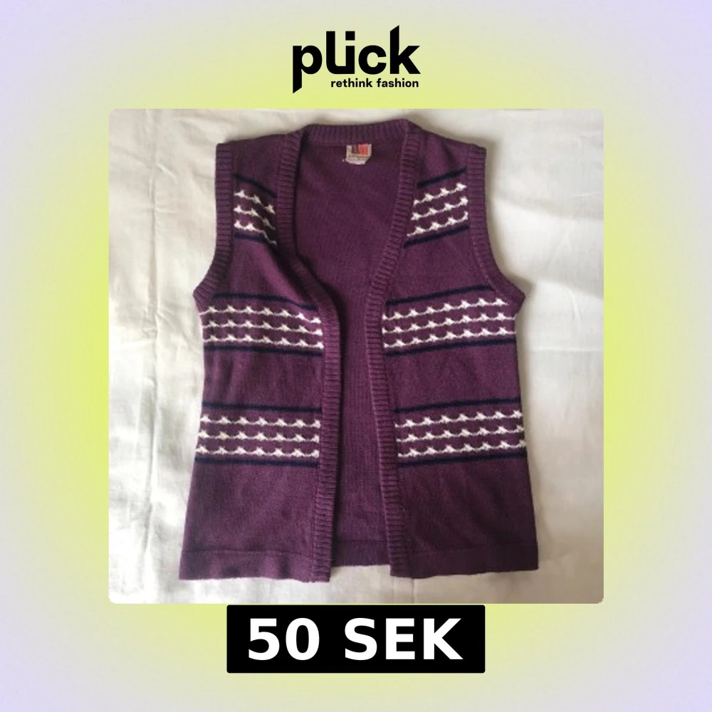 Retro stickad väst från märket Liverpool. Helt lila på baksidan (inget mönster). Saknar storleksetikett, men gissar på S/M.