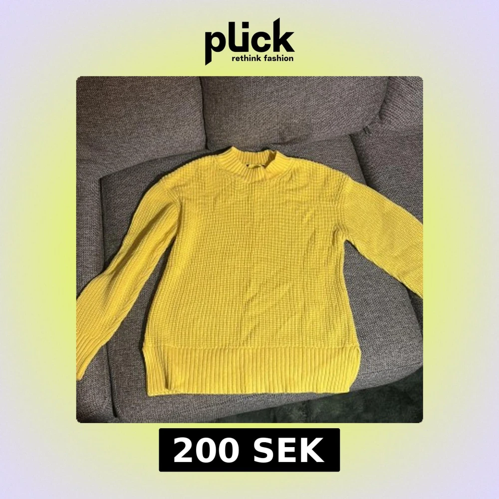 Snygg gul stickad tröja med ribbad kant vid halsen, ärmsluten och nederkanten. Tröjan har en klassisk rund hals och långärmade armar. Asfin att ha på stan o till skola men jätteskön att ha hemma (inte kliig alls)
