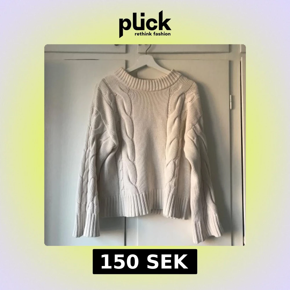 Säljer en mysig vit stickad tröja. Tröjan har en ribbad rund hals och långa ärmar med ribbade muddar. Strl M ifrån Samsa.