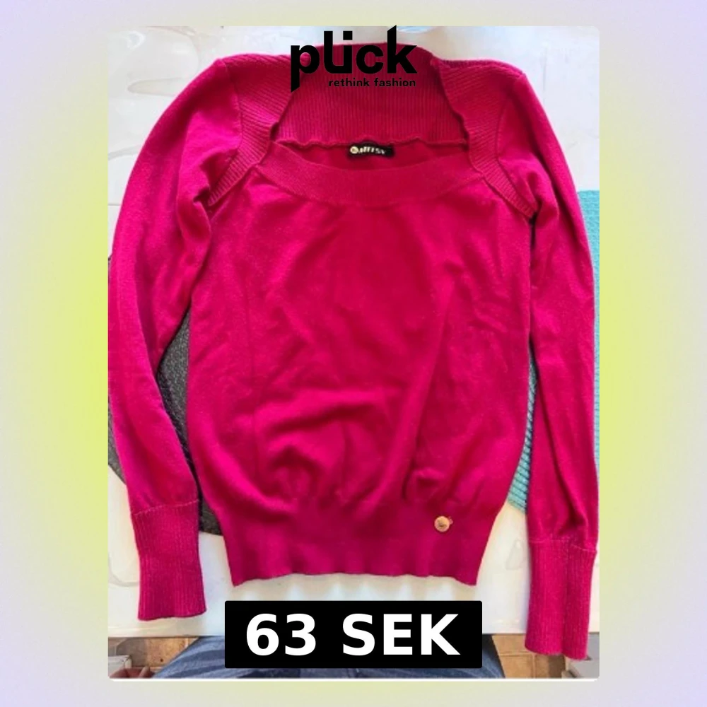 Mysig mörkrosa tröja med bred ribbad krage och långa ärmar. Tröjan har en enkel, stilren design och en liten metallbricka vid nederkanten. Perfekt för dig som gillar färg och vill ha något bekvämt.