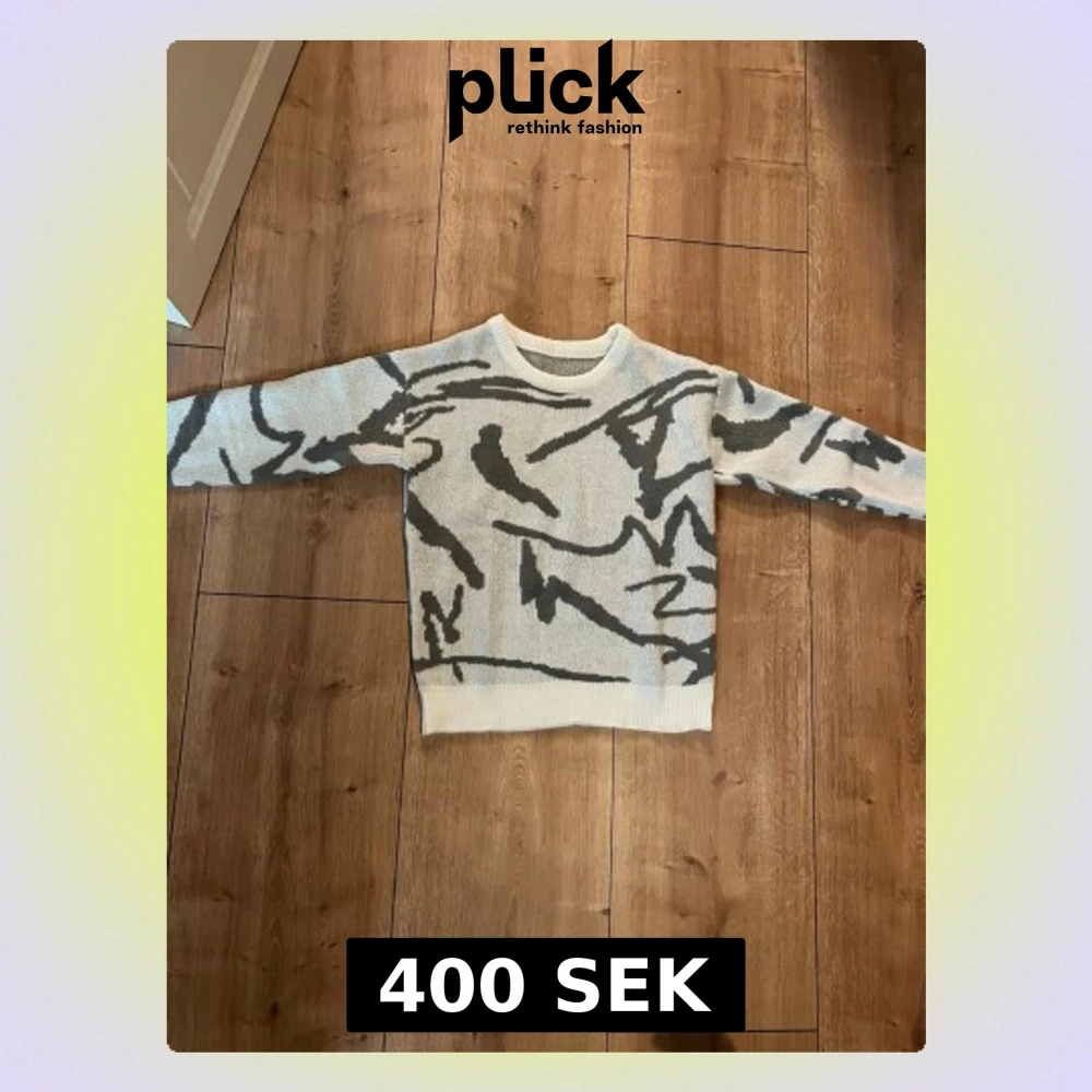 Säljer en stickad tröja i vit bas med grått abstrakt mönster. Tröjan har rund hals och långa ärmar, samt ribbade muddar vid hals, ärmslut och nederkant. Perfekt för dig som gillar unika detaljer och sköna material. Helt ny, oanvänd