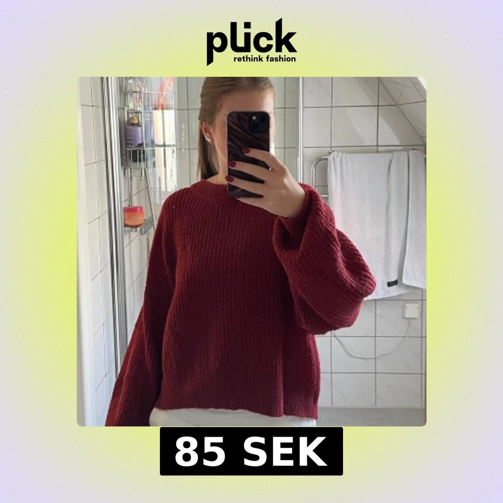 Mysig oversized stickad tröja i vinrött med breda ärmar och rund hals. Använd fåtal gånger, lite längre i bak❤️