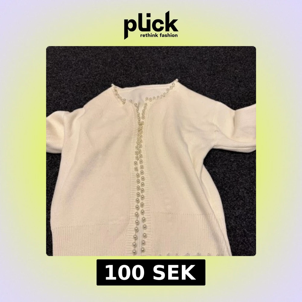 Säljer en vit kofta med snygga pärldetaljer längs halsringningen och hela knappslån. Koftan är stickad och har långärmad design, perfekt för dig som gillar en clean och elegant look med lite extra bling.