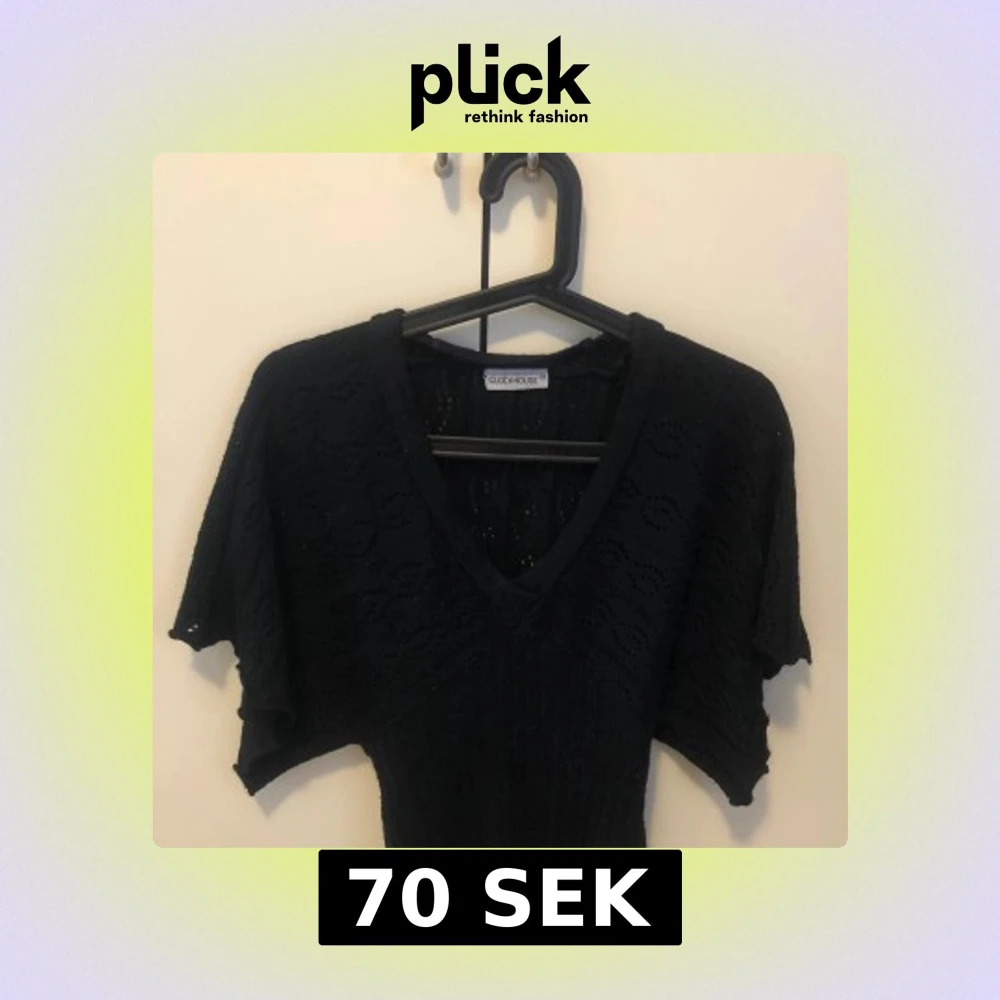 Svart stickad topp från Clockhouse med v-ringning och korta ärmar. Toppen har ett diskret hålmönster och är figurnära nertill. Perfekt för dig som gillar en enkel men ändå snygg stil.