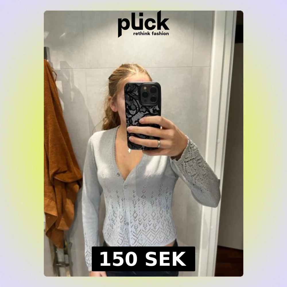 Supersöt ljusgrå stickad kofta med v-ringning och knappar framtill. Koftan har ett detaljerat spetsmönster nertill och på ärmarna, samt lång ärm och croppad passform. Jag har storlek xs/s och den passar mig.