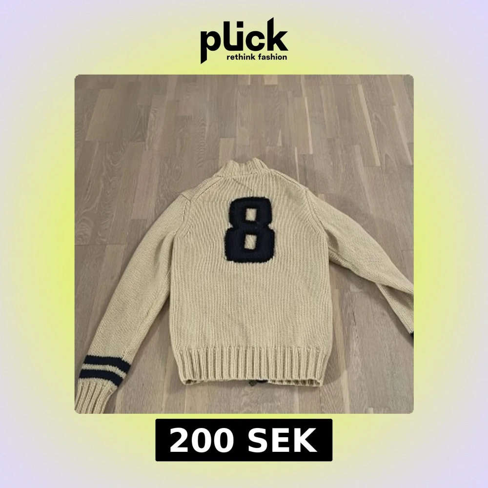 Snygg beige stickad tröja med dragkedja och mörkblå detaljer. Tröjan har ett stort nummer 8 på ryggen och ribbade muddar med ränder på ärmarna. Perfekt för en avslappnad stil.