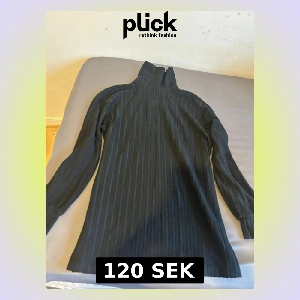 Säljer en svart ribbstickad polotröja med lång ärm. Tröjan har en hög krage och är tillverkad i ett mjukt, stretchigt material som sitter snyggt på kroppen. Perfekt för lager på lager och enkel att matcha med olika outfits.
