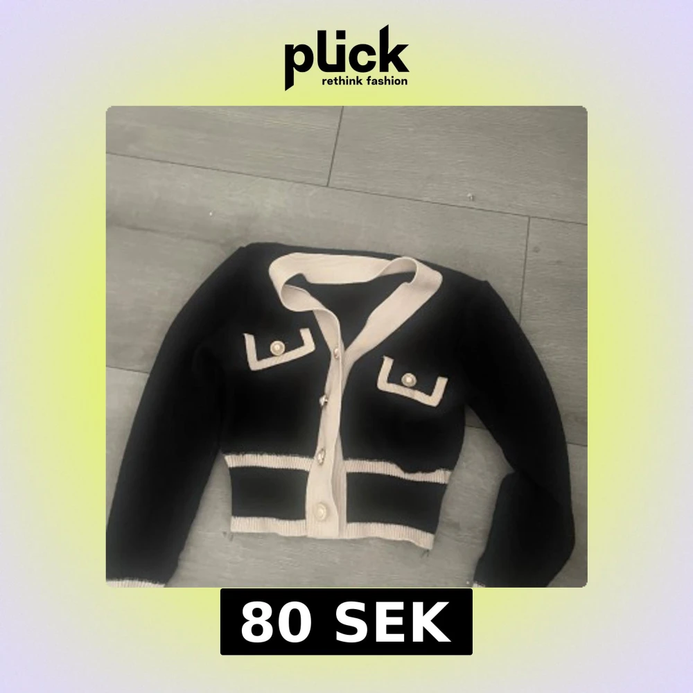 Snygg svart kofta med beige detaljer och pärlknappar. Croppad modell med långa ärmar, dekorativa fickor framtill och ribbade kanter. Perfekt för dig som gillar en chic och trendig look.