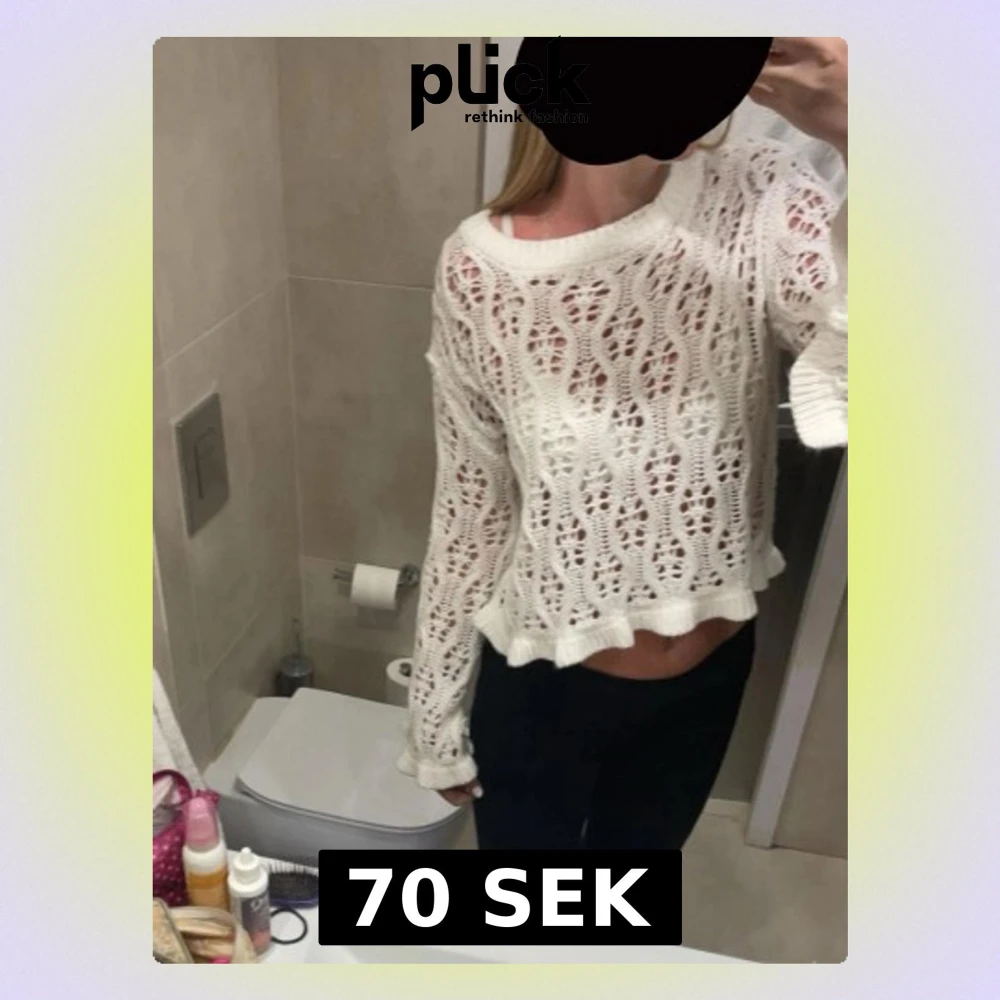 Säljer en vit stickad tröja med genombrutet mönster och croppad passform. Tröjan har långa ärmar och en vågig kant nertill som ger en söt touch. Perfekt att styla över ett linne eller bralette.