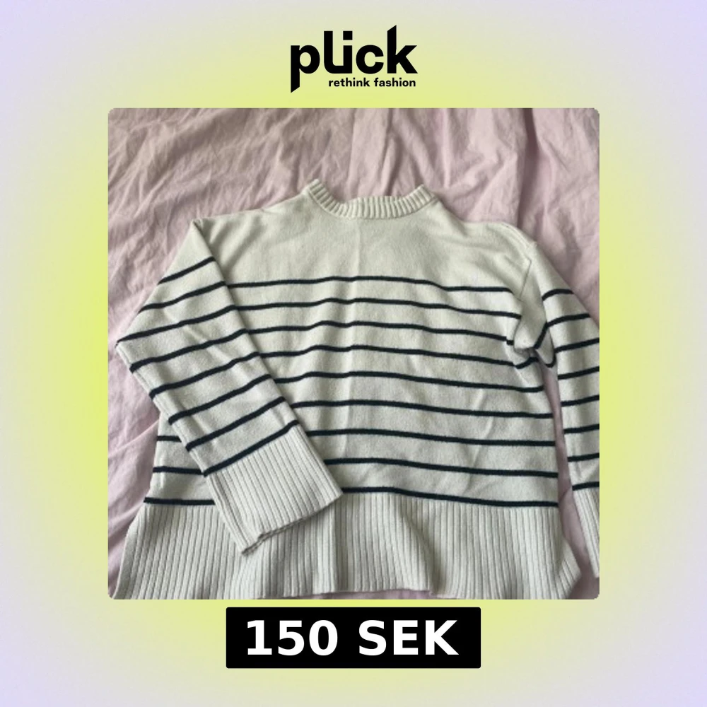 Säljer en vit stickad tröja med svarta ränder. Tröjan har långärmade ribbade muddar och bred ribbad nederkant med slits på sidorna. Perfekt för dig som gillar klassisk stil med en twist. Rund halsringning och mjukt material.