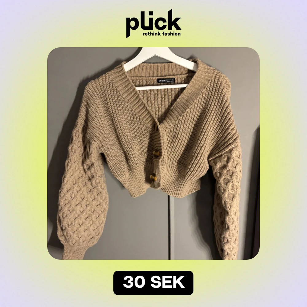 Säljer en superfin beige stickad kofta från SHEIN. Den har en v-ringad design med stora knappar framtill och ett snyggt mönster på ärmarna. Perfekt för höst och vår när du vill vara både varm och stilren. Passar perfekt till jeans eller kjol!