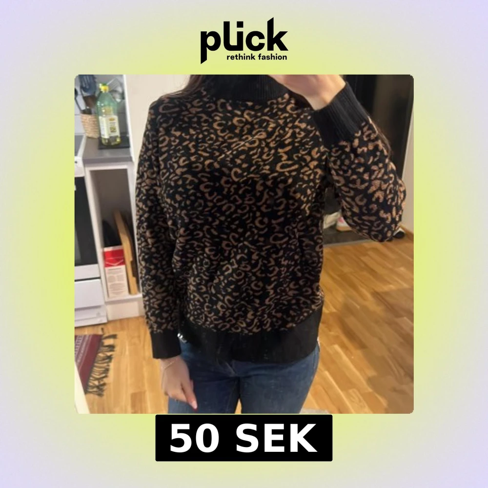 Säljer en svart stickad tröja med brunt leopardmönster och hög krage. Tröjan har långa ärmar och ribbade muddar vid ärmslut och nederkant. Perfekt för dig som vill ha en trendig och bekväm look.