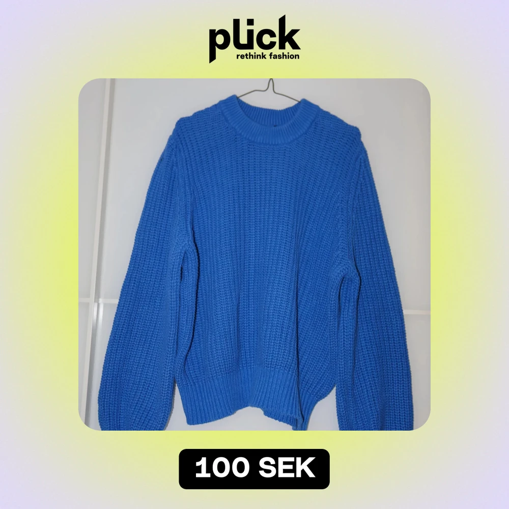 Säljer en superfin blå stickad tröja som är perfekt för kyliga dagar. Den har en mysig och varm känsla med långa ärmar och en ribbad struktur. Passar perfekt till både jeans och kjol. Perfekt för höst och vinter!