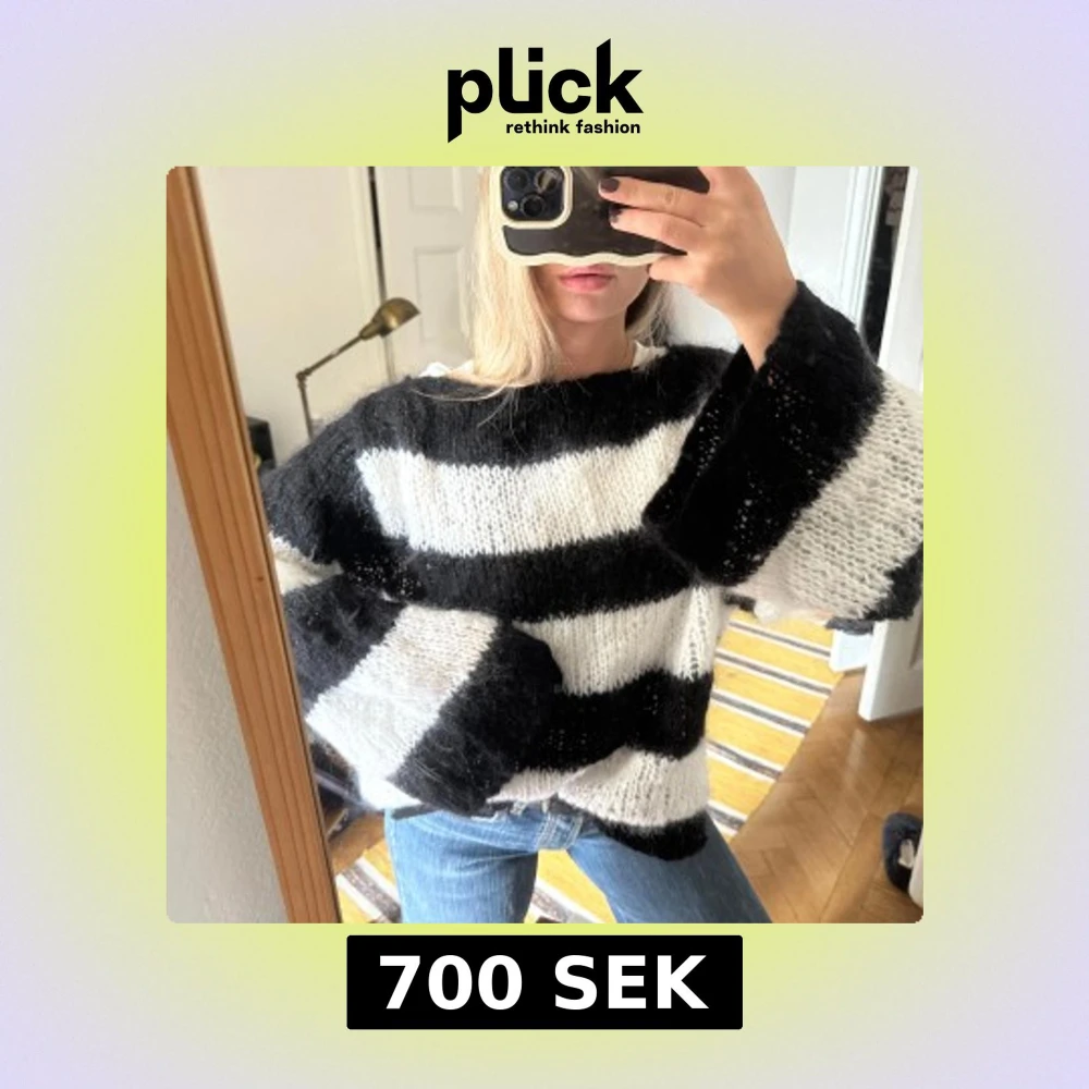 Säljer en oversized stickad tröja med breda svarta och vita ränder. Tröjan har lång ärm och är supermjuk med en fluffig känsla. Perfekt för dig som gillar en chill och trendig look med lite extra volym i ärmarna.