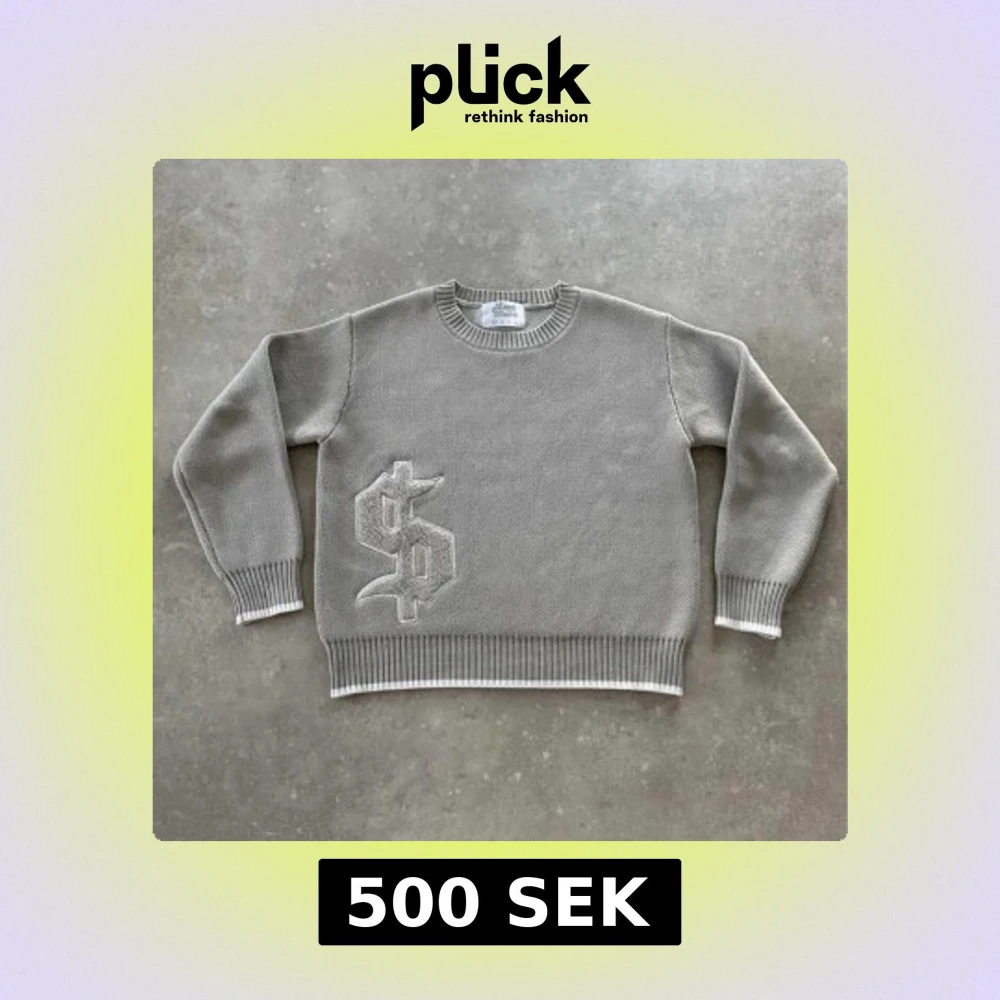 Säljer en grå stickad tröja från Homme Studio med en stor, broderad dollarpatch på framsidan. Tröjan har rund hals, ribbade muddar och vita detaljer vid ärmslut och nederkant. Perfekt för dig som gillar streetstyle och unika detaljer.