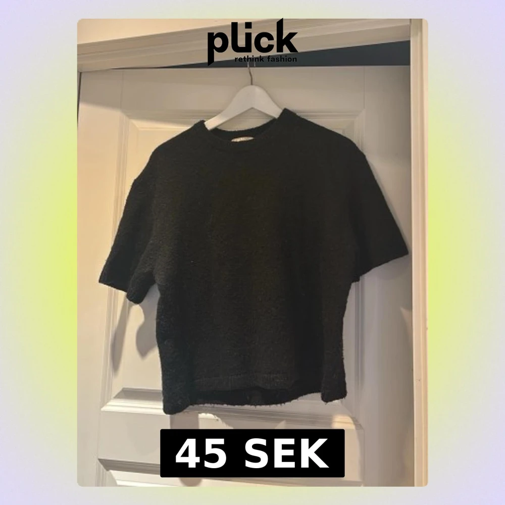 En svart stickad t-shirt med korta ärmar och rund hals. Den är från Gina i storlek M skriv om du har frågor eller vill diskutera pris❤️