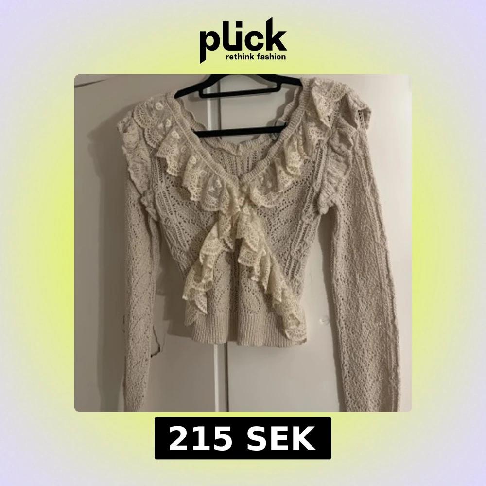 Superfin beige stickad tröja med lång ärm och bred spetsvolang runt halsringningen och axlarna. Från Zara!