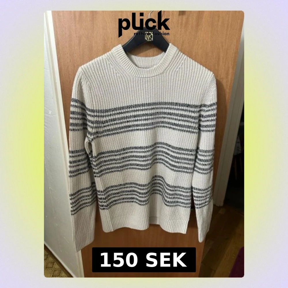 Snygg beige stickad tröja med svarta horisontella ränder. Tröjan har rund halsringning och långa ärmar. Grovstickad struktur ger en avslappnad vibe och passar perfekt till jeans eller kjol. Materialet känns mjukt och bekvämt.