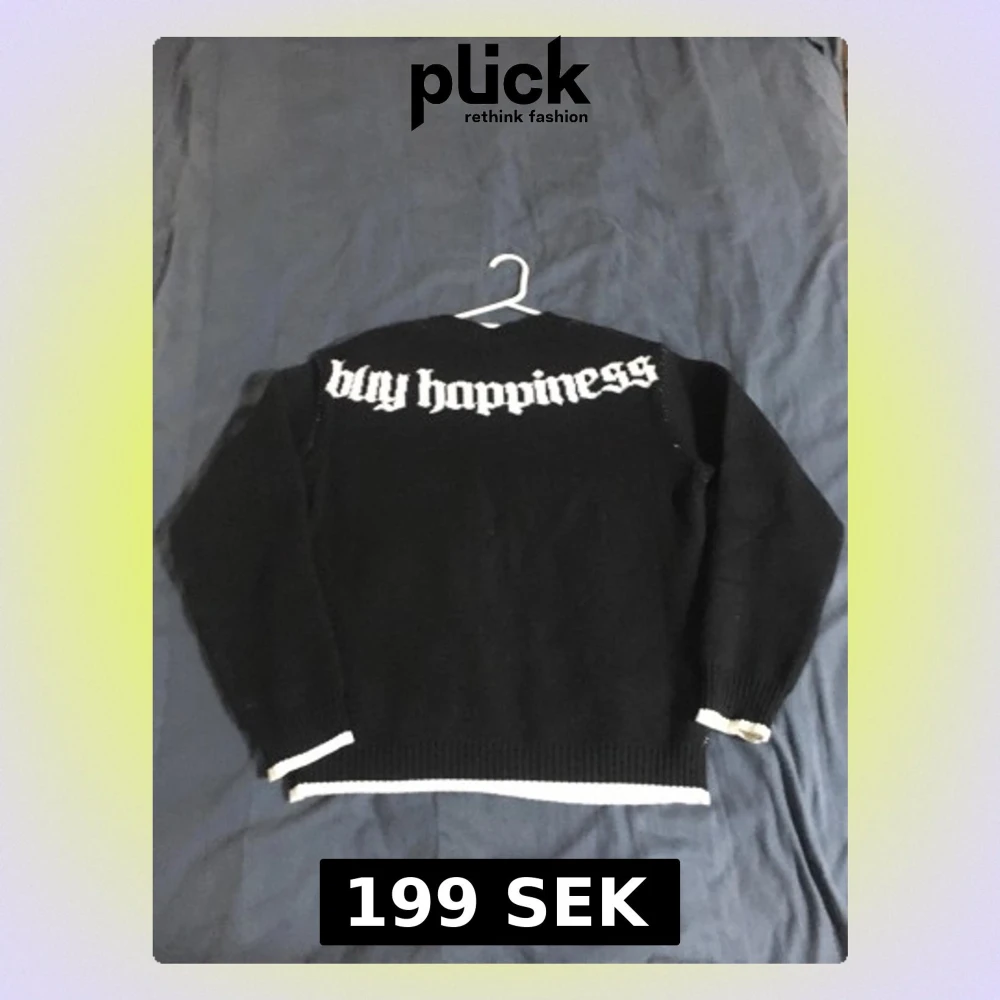 Cool svart stickad tröja med vit text 'buy happiness' på ryggen och en stor vit $-symbol framtill. Tröjan har rund hals, långa ärmar och vita detaljer vid ärmslut och nederkant. Perfekt för dig som gillar streetstyle och statement-plagg.