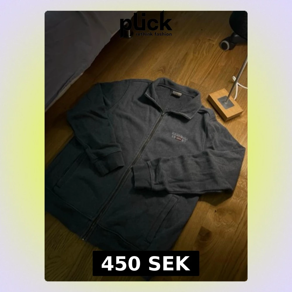Mörkgrå stickad ziptröja från Napapijri med broderad logga och årtalet 1987 på bröstet. Tröjan har hög krage, hel dragkedja och två fickor framtill. Perfekt för lager-på-lager och chill vardagsstil.